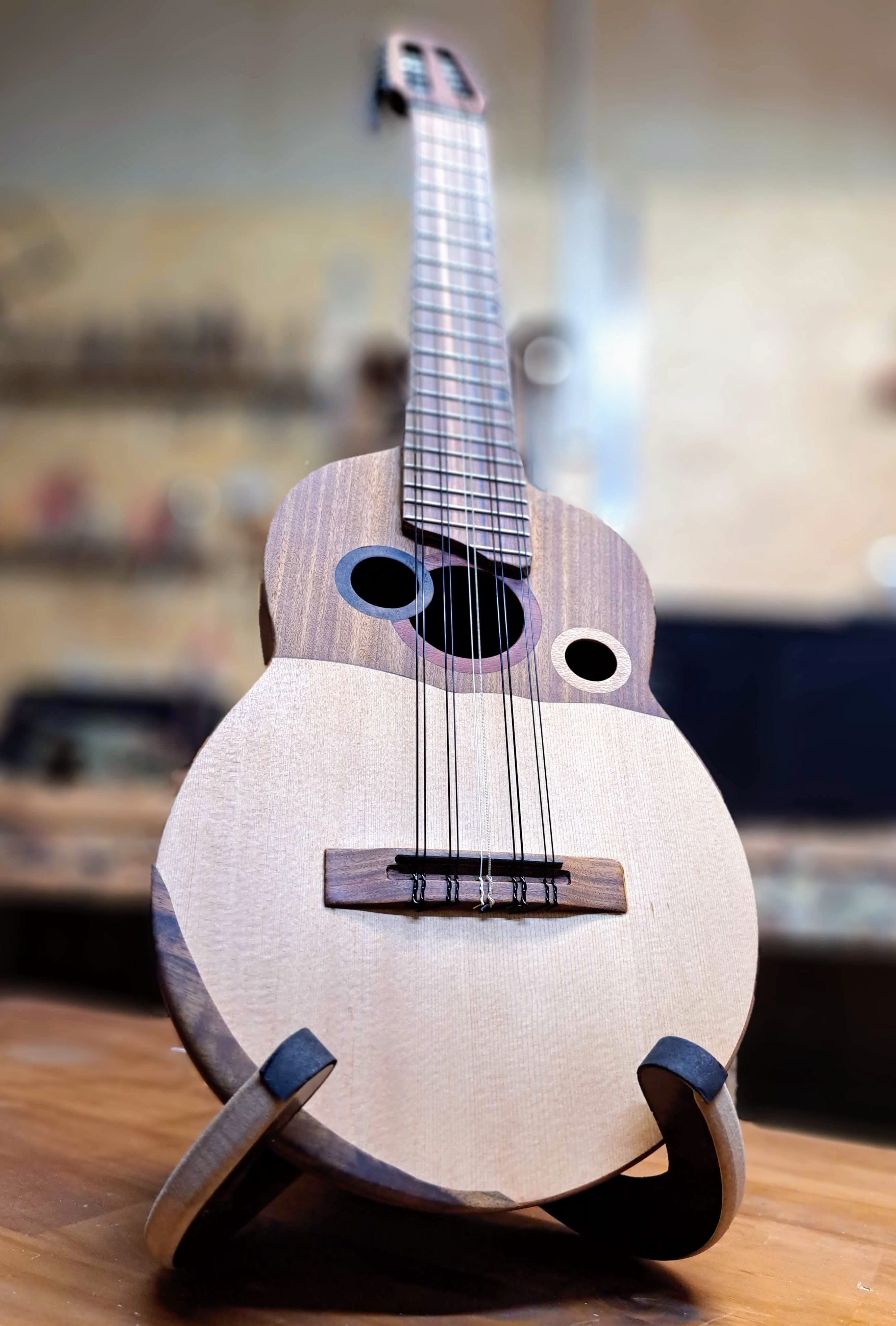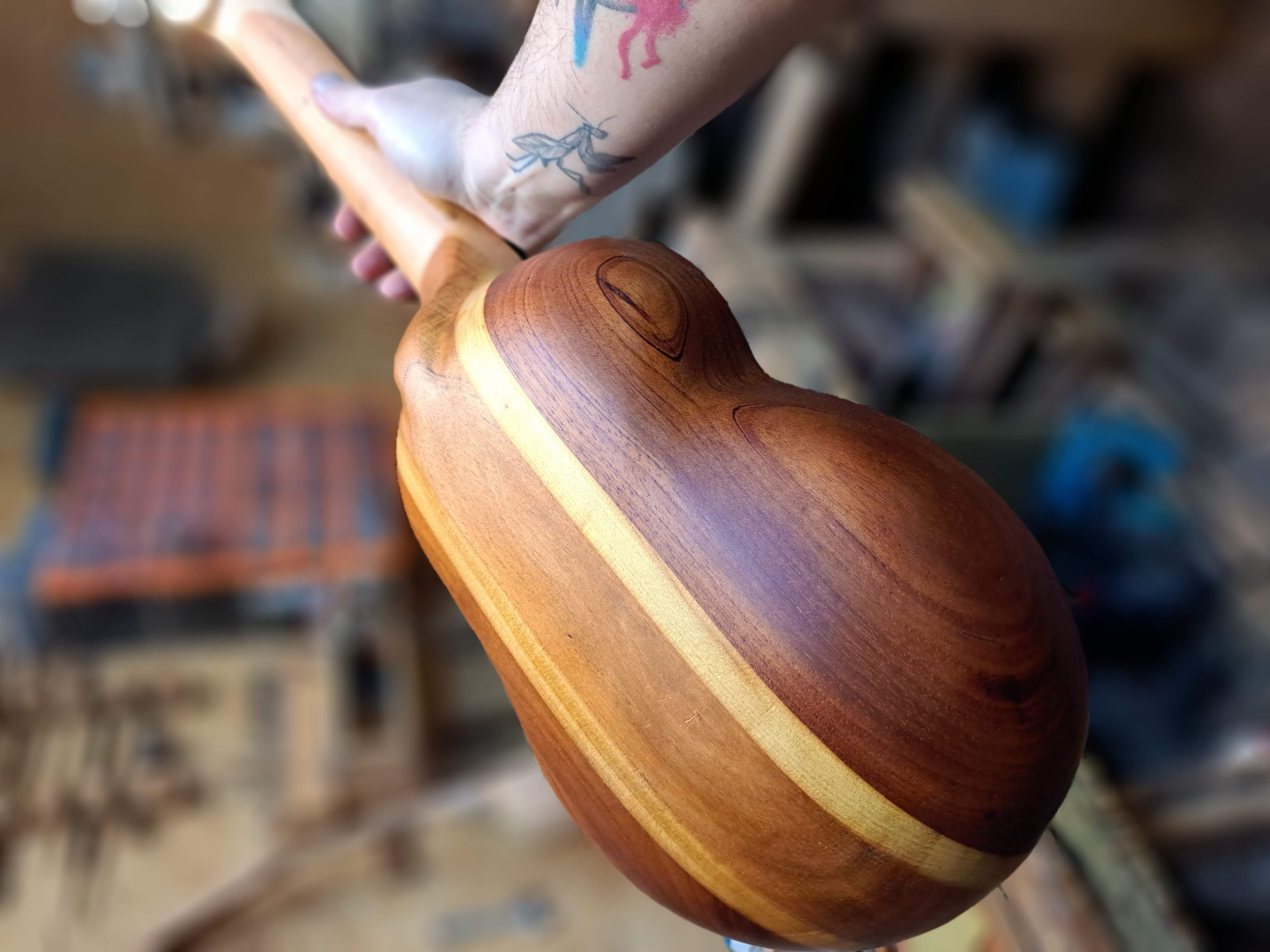 Las cajas y mangos son “laminados”, construidos en varias piezas de maderas cuidadosamente seleccionadas. Los objetivos de este formato son: garantizar y aumentar la estabilidad del instrumento, aprovechar la utilización de piezas únicas de maderas muy estacionadas y secas (no menos de 20 años de antigüedad, idealmente de secado natural) y lograr figuras que aportan a la estética visual de la pieza.
